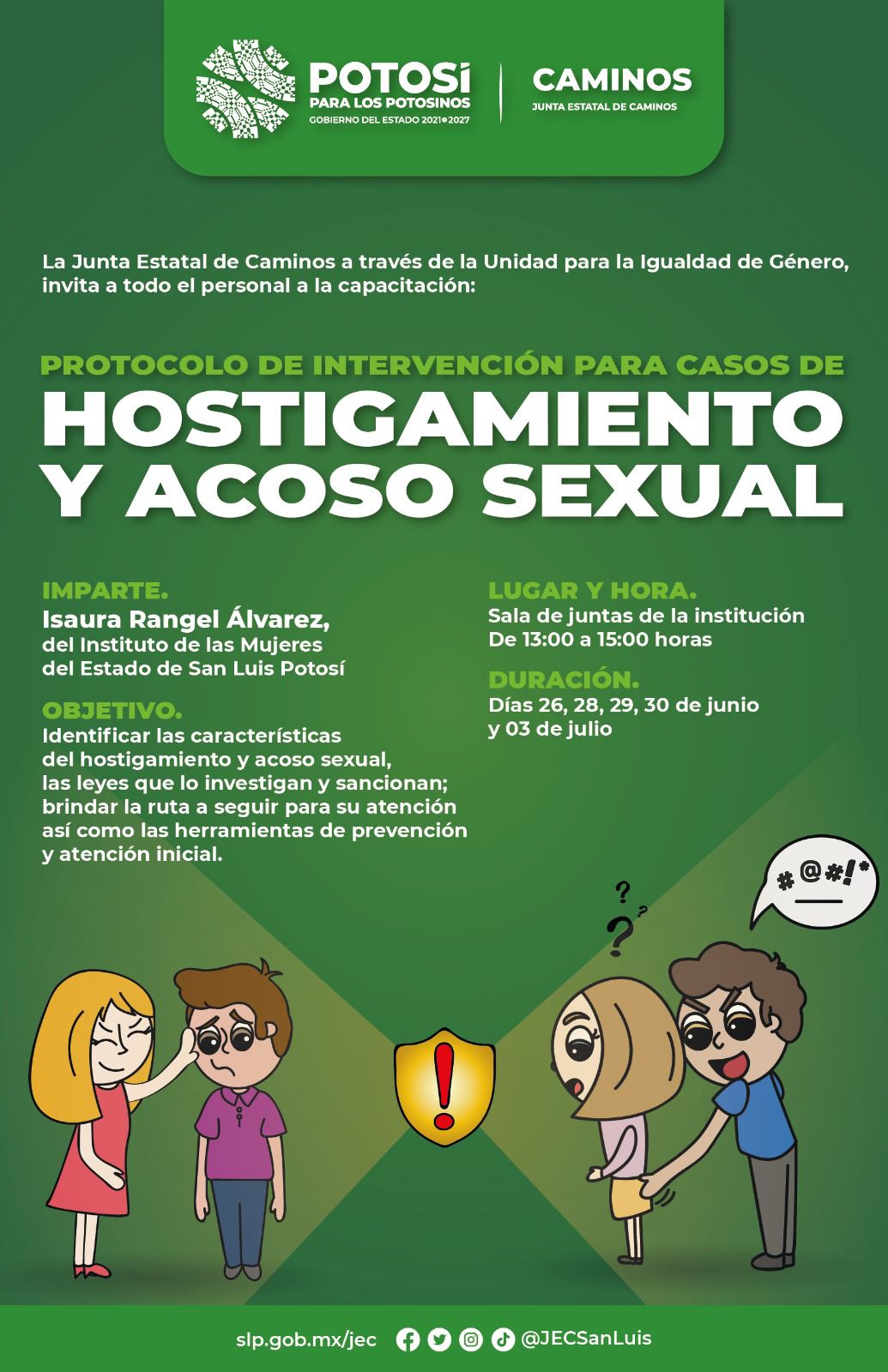La Junta Estatal de Caminos (JEC), desarrolló una capacitación sobre el protocolo de atención contra el Hostigamiento y Acoso Sexual (HAS) dirigido a 20 mujeres y hombres que integran el Comité de Cultura Institucional, el área de Recursos Humanos y el Área Responsable de la Ejecución de Obra, en apoyo a garantizar la atención de quejas y denuncias, mejorar el servicio de las y los trabajadores del Gobierno y construir espacios libres de violencia contra las mujeres.