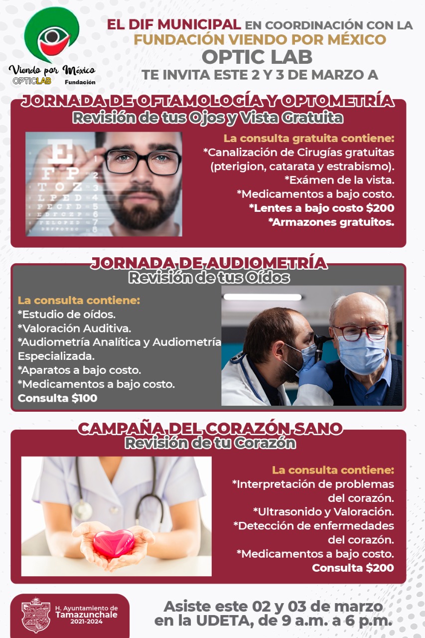 Consultas para canalización de cirugías de ojos gratuitas, exámenes de la vista, revisión y estudio de oídos, valoración auditiva, audiometría analítica y especializada, así como consulta, interpretación y detección de problemas del corazón, se llevarán a cabo sin ningún costo, por parte del DIF de Tamazunchale, en coordinación con la Fundación “Viendo por México” OpticLab.