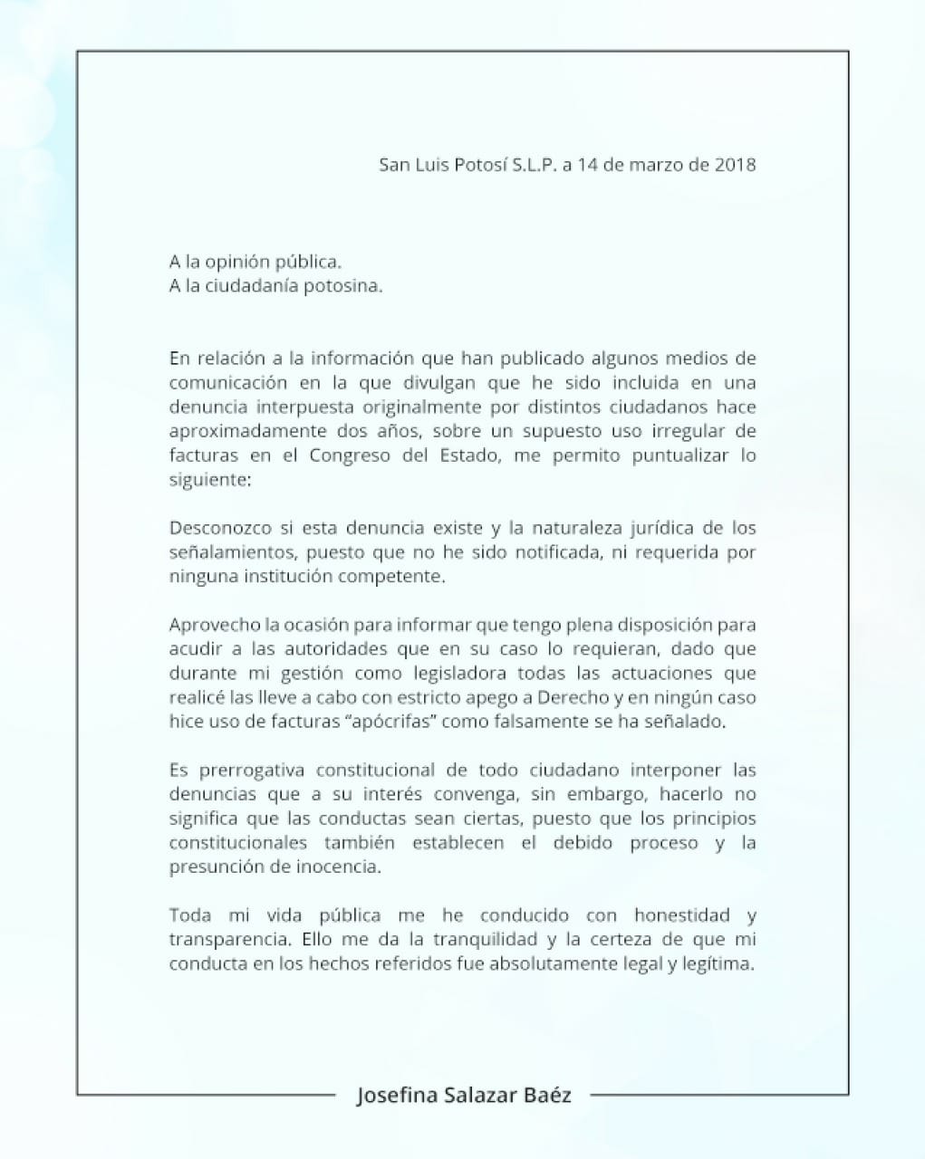La diputada con licencia Josefina Salazar ha enviado un comunicado en el que niega rotundamente el haber usado facturas apócrifas.