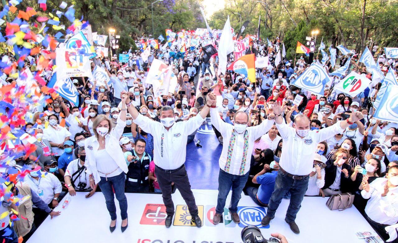 Previo a ondear las banderas de los cuatro partidos políticos como el PAN, PRI, PRD y Conciencia Popular que conforman la Coalición, Octavio Pedroza afirmó que el 6 de junio se dará el primer paso para la reconstrucción de un nuevo México, dado que en esta elección no solo se elige gobernador, alcaldes, diputados locales y diputados federales, sino que también se define “el rumbo que queremos darle a nuestro país”.