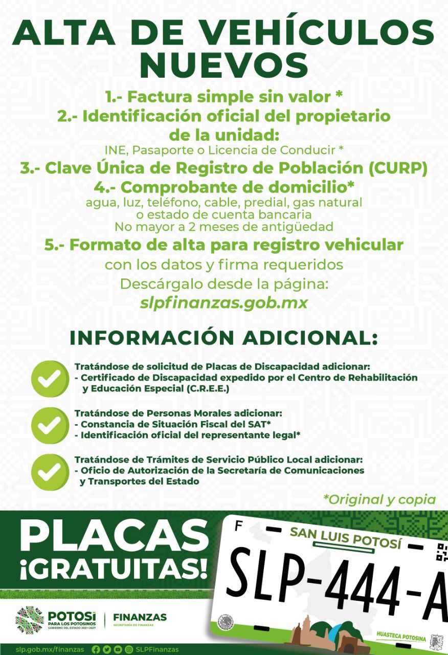 En esta primera etapa, quienes podrán tramitar las Placas Gratis son: vehículos nuevos y cambio de propietario de menos de 500 mil pesos con placas de San Luis Potosí; entre estos, propietarios de remolques, motocicletas y motonetas hasta de 350 c.c. de cilindro.