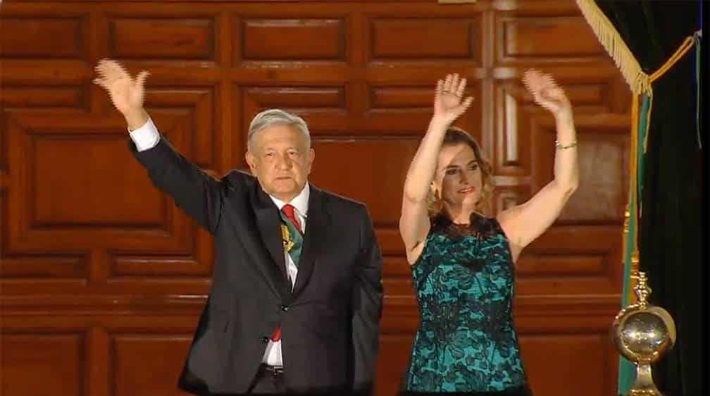 El Presidente llegó al balcón presidencial acompañado de su esposa Beatriz Gutiérrez Müller para tomar la bandera e iniciar su arenga de 98 segundos, en el que lo mismo recordó a los héroes de la Independencia que a los héroes anónimos, a las comunidades indígenas, que a conceptos como la democracia o la fraternidad universal.