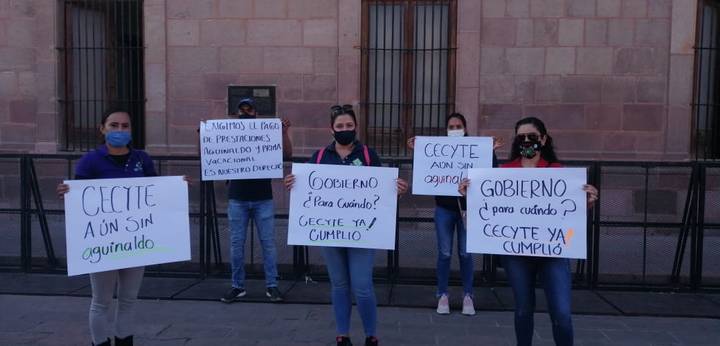 Se manifiestan en el primer cuadro de la ciudad maestros pertenecientes al Sindicato Único de Trabajadores del Colegio de Estudios Científicos y Tecnológicos de San Luis Potosí, SUTCECYTE, debido a que no les han pagado aguinaldos homologación salarial y otras prestaciones que superan los 100 millones de pesos.