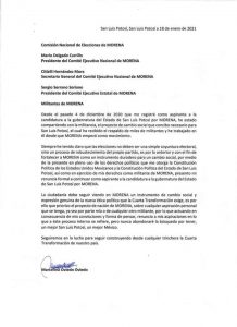 En la misiva, justificó su decisión con la finalidad de fortalecer el movimiento morenista en San Luis Potosí, como un “instrumento” duradero para un cambio social.