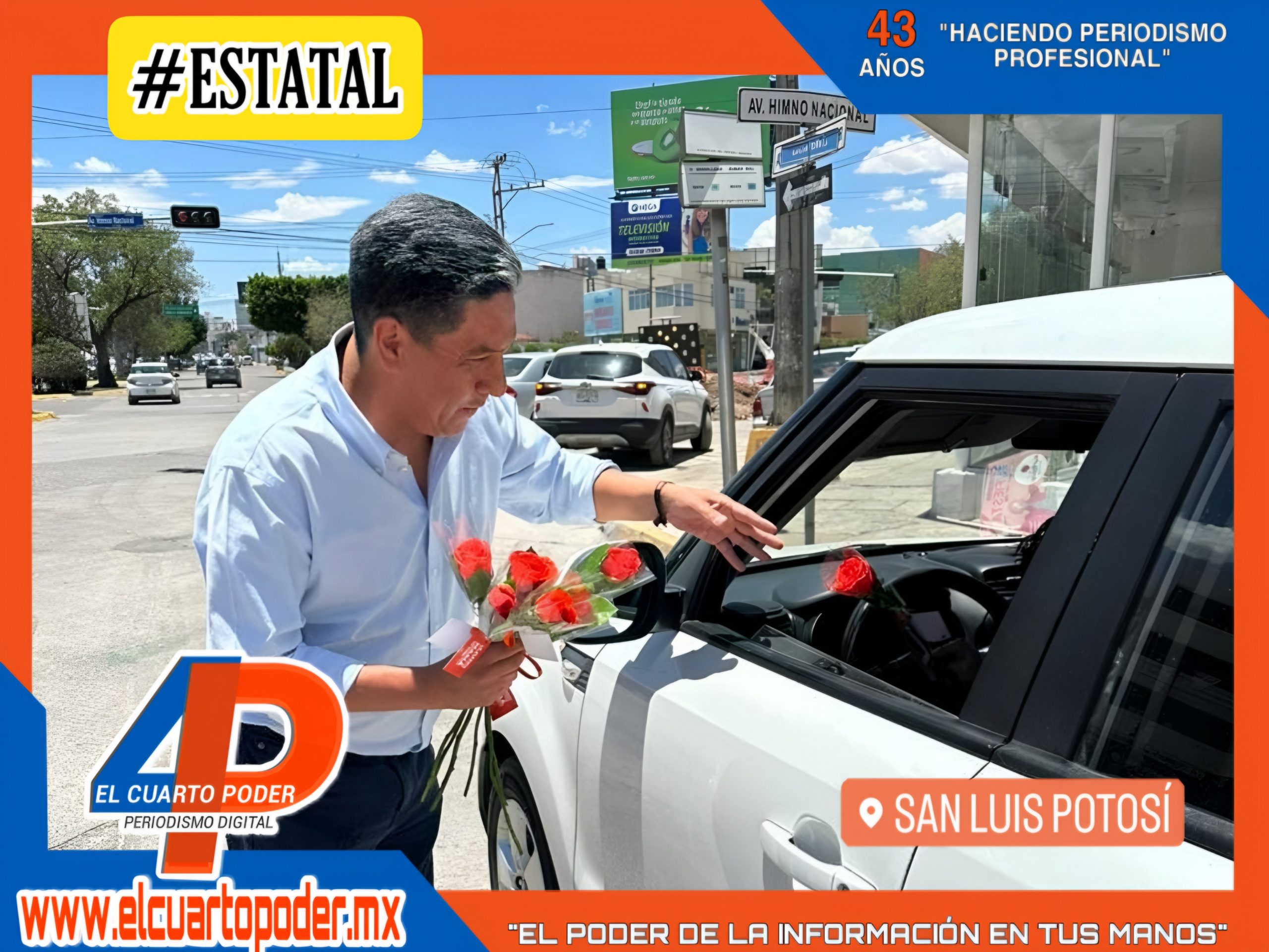 En un concurrido crucero de la Capital potosina, él también senador por San Luis Potosí, acompañado por un grupo de entusiastas jóvenes integrantes de Movimiento Ciudadano, entregó rosas a las mamás, cómo muestra de respeto y reconocimiento al diario esfuerzo que ponen para sacar adelante a sus familias.
