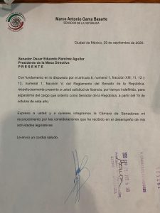 En su solicitud de licencia, Gama Basarte manifestó al Senador Óscar Eduardo Ramírez Aguilar, Presidente de la Mesa Directiva de la Cámara Alta, su agradecimiento por el respaldo recibido para el ejercicio de sus funciones.