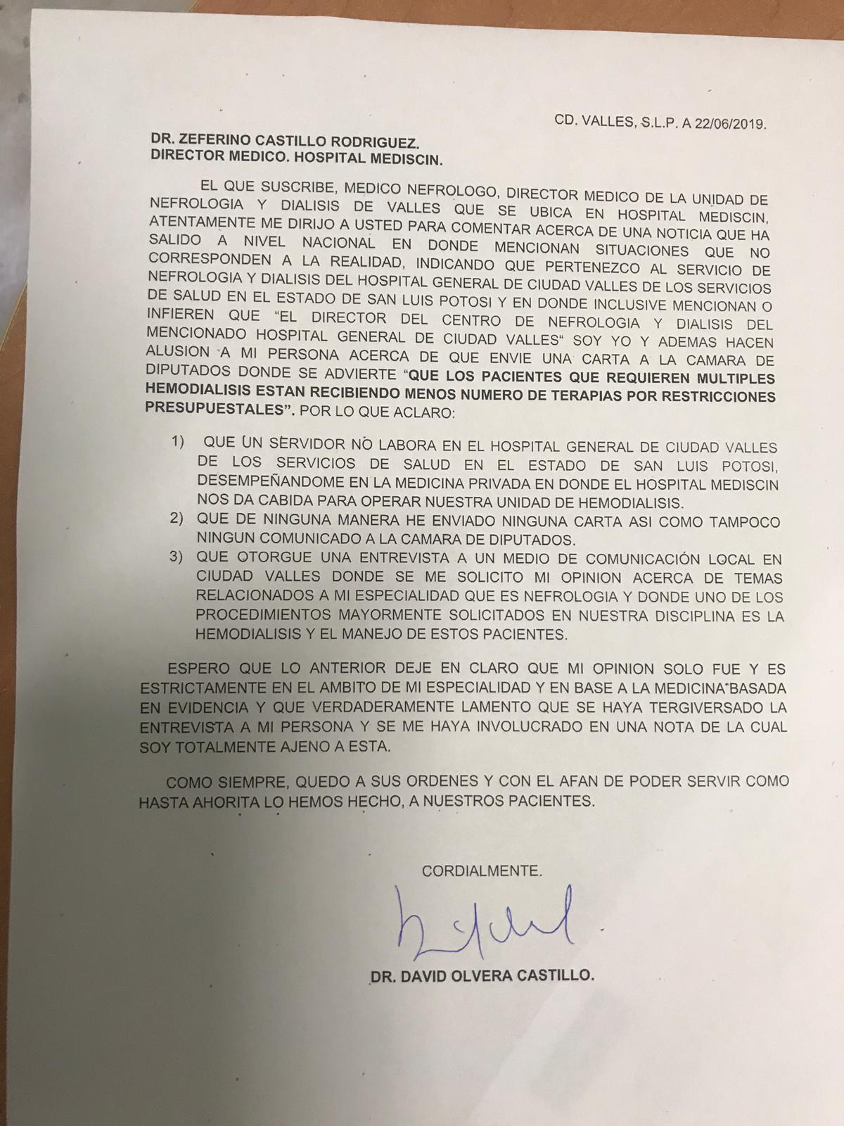 El médico nefrólogo de Ciudad Valles David Olvera Castillo, lamentó haber sido usado en una entrevista con un medio local para ser mostrado en una nota periodística nacional, usando su nombre, ostentando un cargo que no tiene y lo más grave, donde se dice: “haber enviado una carta a la Cámara de Diputados para decir que existen pacientes de hemodiálisis en el Hospital General de Ciudad Valles que están recibiendo medias terapias por falta de presupuesto”.