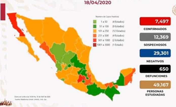 En México aumentaron este sábado a 650 los fallecimientos por la COVID-19, con 104 nuevos decesos respecto a los 546 del día anterior, y a 7.497 los casos de contagios motivados por esta enfermedad, 622 más que los del reporte del día anterior, informaron las autoridades sanitarias.