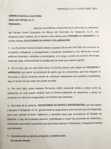 Algunos otros integrantes del Partido Verde, comentan que personas extrañas al municipio intimidan a simpatizantes del PVEM cuando aprecian que portan calcomanías de los candidatos del Verde “Es el caso, que de unos días hacia la fecha, hemos sido objeto de violencia y amenazas por parte de personas que no conocemos, que han llegado al municipio, y ahora tenemos miedo de continuar trabajando con nuestros candidatos, bajo el temor de que algo nos pueda suceder”, explican en el documento entregado al Consejo Estatal Electoral y de Participación Ciudadana (CEEPAC).