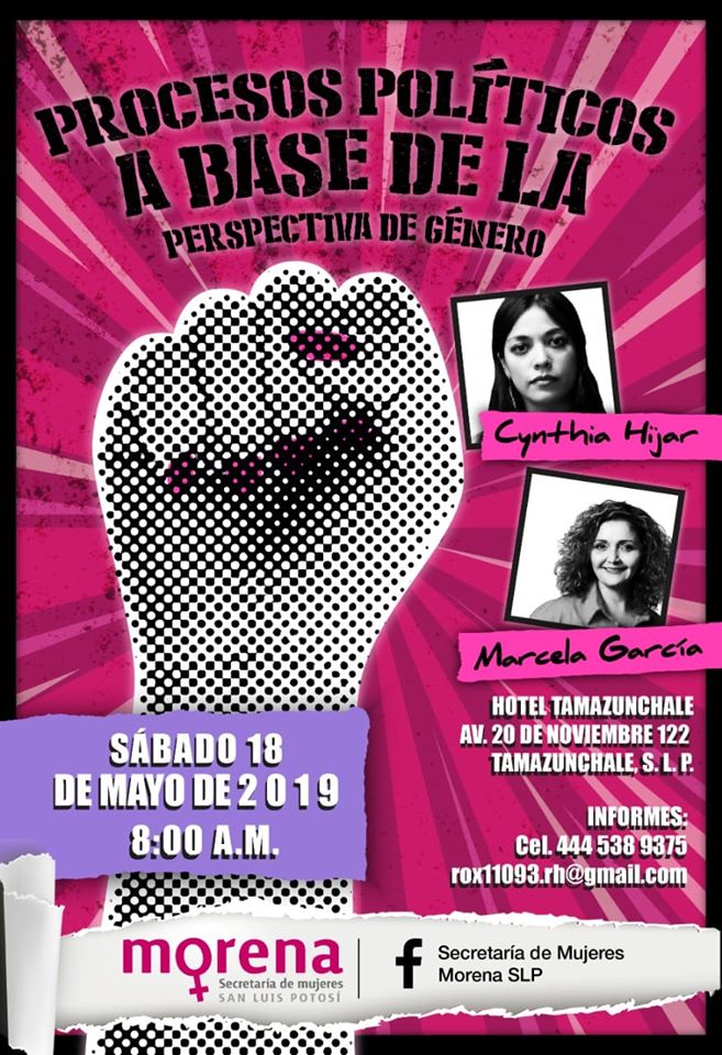 El Comité Estatal de Morena SLP a través de la Secretaría de Mujeres invita a la conferencia denominada “Procesos Políticos a Base de la Perspectiva de Género” que se impartirá éste sábado 28 de mayo a partir de las 8 de la mañana, en el Hotel Tamazunchale, ubicado en avenida 20 de noviembre 122 en el crucero de Tamazunchale.