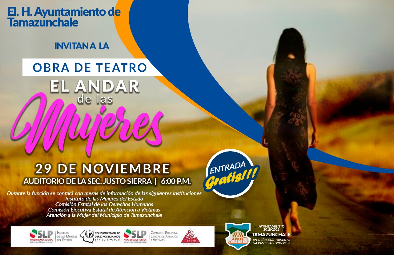Como parte de las acciones que implementa el ayuntamiento de Tamazunchale que encabeza Toño Costa en busca de la erradicación de la violencia contra la mujer se están llevando a cabo diversas actividades de prevención y sensibilización dirigidas a la población. Dentro de estas actividades está programada una obra de Teatro “El Andar de las Mujeres”.