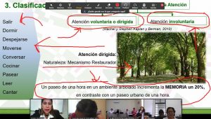 Estos cursos fueron impartidos por Virginia Leticia Arriaga Castillo, quien explicó a las y los participantes los conceptos, ART. Atention Restoration Theory, la exposición a estímulos naturales; Medio Ambiente laboral y su impacto y los beneficios del contacto con la naturaleza.