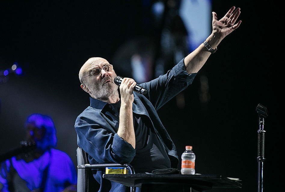 Y es que a sus 67 años Collins emergió sobre el escenario caminando lentamente, encorvado y apoyándose de un bastón para llegar al centro del foro entre aplausos ensordecedores, para tomar asiento en una silla y dar rienda suelta a un intenso show de más de una hora.