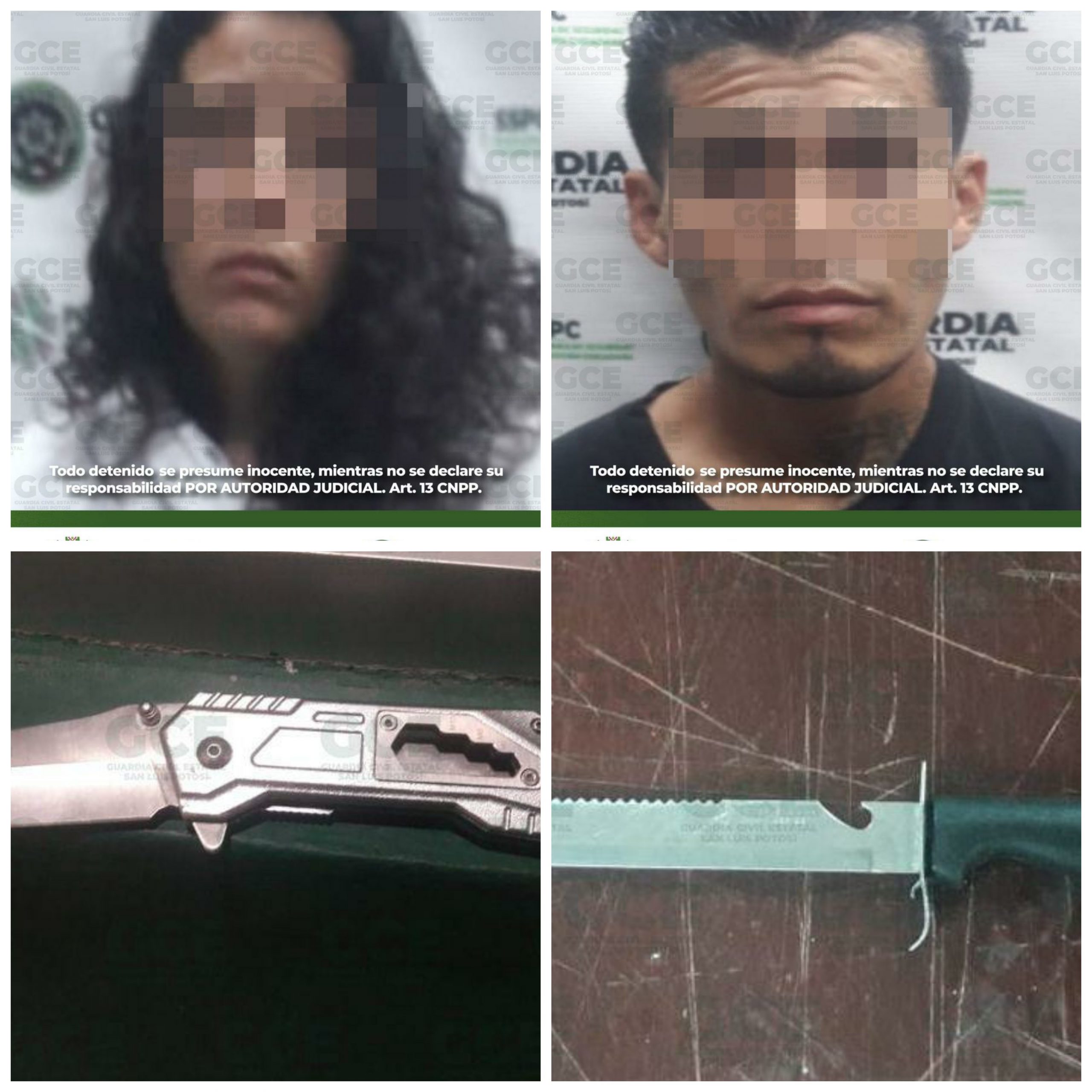 San Luis Potosí, S.L.P.- Dentro de los resultados de los operativos de seguridad en la capital potosina y su zona conurbada, oficiales de la Guardia Civil Estatal detuvieron a una mujer y un hombre por presunta portación de armas prohibidas.