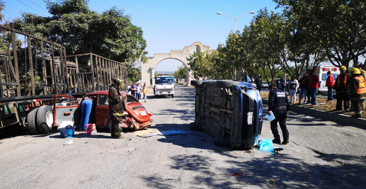 Por el fuerte golpe, el conductor del “vocho” perdió el control, y salió proyectado contra el remolque de un tráiler estacionado, mientras que el Toyota Yaris volcó.