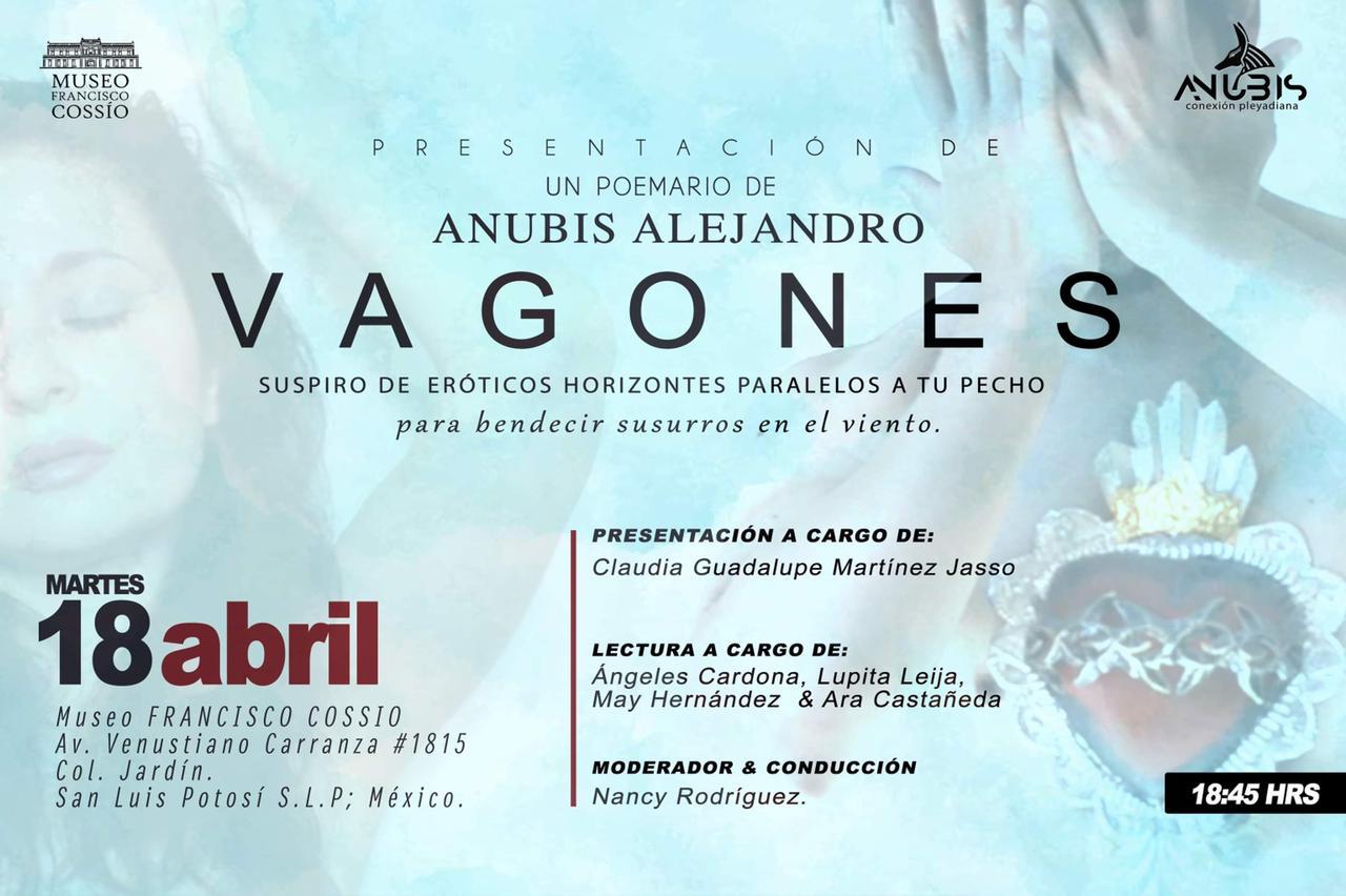 El próximo martes 18 de abril del 2023, se llevará a cabo la Presentación del libro POEMARIO: VAGONES, “Suspiro de eróticos horizontes paralelos a tu pecho para bendecir susurros en el viento”, del autor Anubis Alejandro.