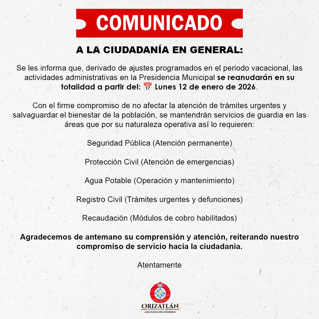 El H. Ayuntamiento informa a la población que, debido a ajustes programados durante el periodo vacacional, las actividades administrativas en la Presidencia Municipal se reanudarán en su totalidad a partir del lunes 12 de enero de 2026.