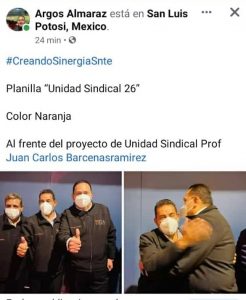 El día de ayer dirigentes sindicales tanto del estado, como regionales y municipales que conforman la estructura de la sección 26 del SNTE, se pronunciaron por registrar una PLANILLA DE UNIDAD denominada “UNIDAD SINDICAL 26” y que es encabezada por su compañero el Prof. Juan Carlos Bárcenas Ramírez, reconocido dirigente que le ha tocado trabajar desde abajo y que con su carisma y profesionalismo se ha desempeñado buscando siempre el apoyo para los maestros en las diferentes zonas del estado de San Luis Potosí hasta donde ha sido comisionado por parte de su organización sindical.
