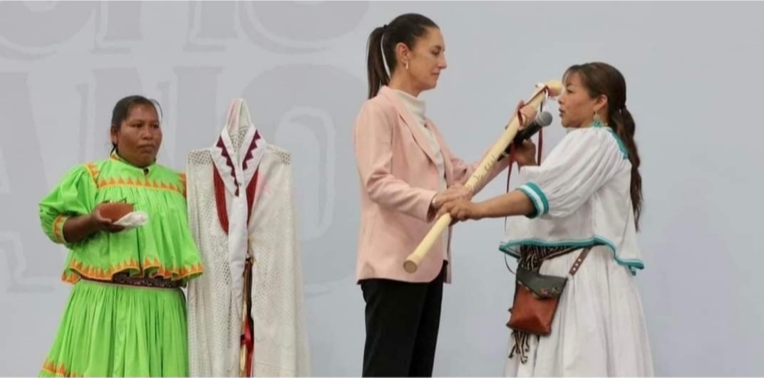 Al finalizar su discurso, Sheinbaum Pardo, fue galardonada por las comunidades originarias de la entidad al recibir el bastón de mando rarámuri de los cuatro pueblos indígenas del Estado Grande de Chihuahua, de manos de Edith Palma, jefa suprema del consejo tarahumara, quien con una ceremonia tradicional compartió uno de los rituales más sagrados de la cultura, el cual representa el progreso y el avance.