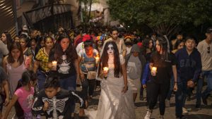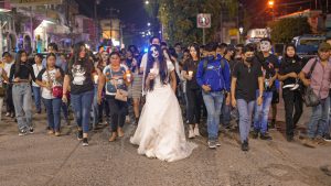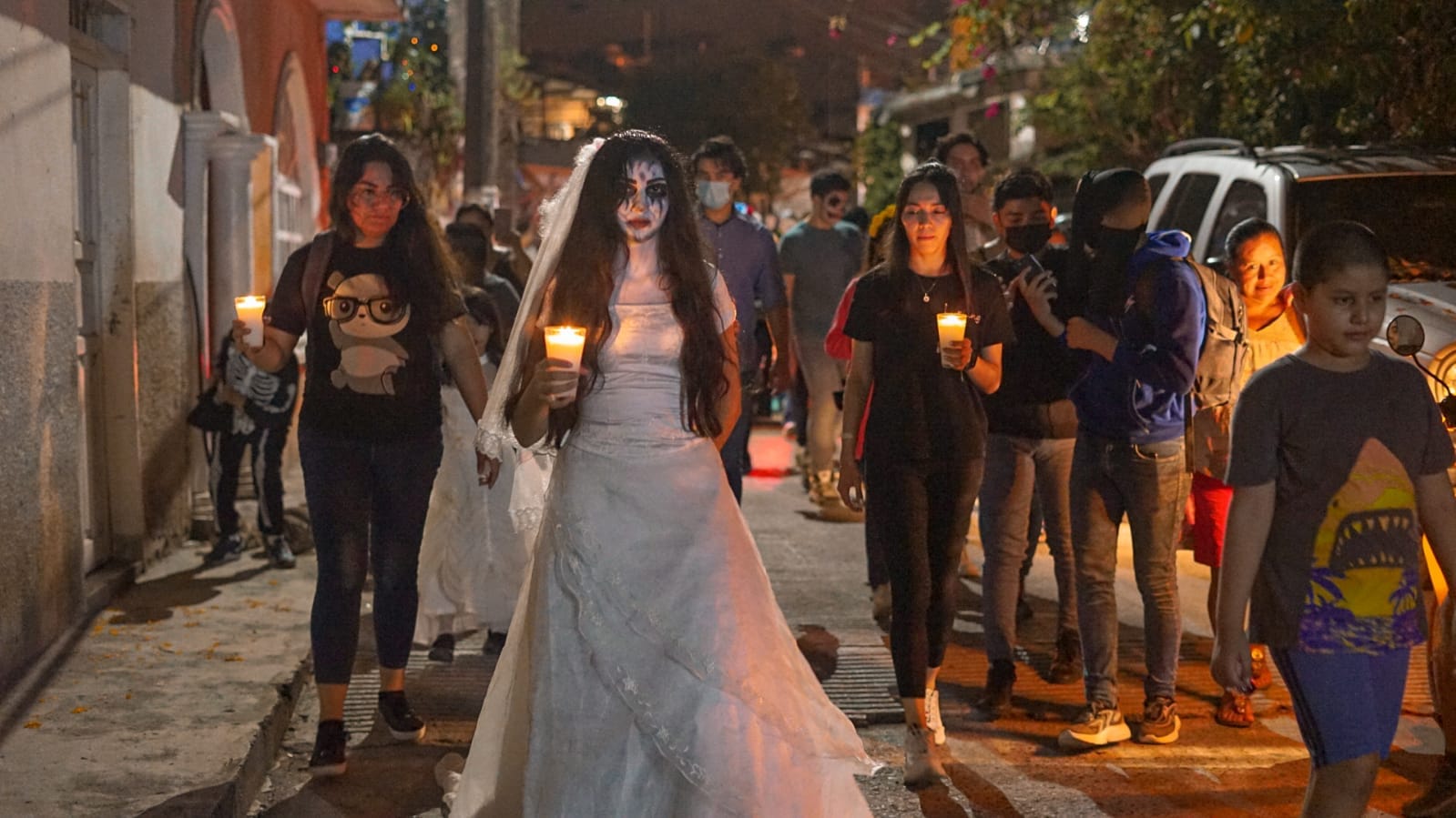 La llorona según la leyenda mexicana, es un espectro, un alma en pena que recorre, ríos, pueblos y ciudades, en busca de sus hijos ahogados, salió hoy personificada del Callejón Zoyotla de Tamazunchale, S.L.P., donde antiguos lugareños señalan haberla escuchado, para realizar un recorrido junto a decenas de personas, rumbo al Panteón de San Miguel.