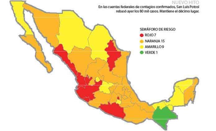 Las otras tres entidades que están en rojo, la Ciudad de México, Nuevo León y Jalisco, presentan cifras más altas que San Luis en ambos rubros.