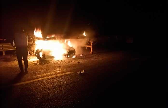 Fue alrededor de la medianoche, cuando los elementos de Protección Civil de Tamuín se trasladaron al entronque de la carretera de cuota y la carretera libre Valles-Tampico, pues les reportaron que un tráiler estaba en llamas.