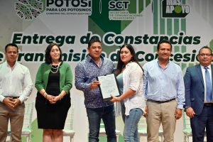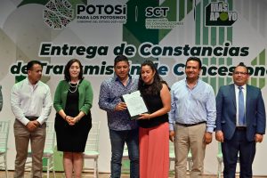 En un acto más de justicia social, 214 familias potosinas recibieron las constancias de transmisión de concesiones de la Secretaría de Comunicaciones y Transportes (SCT), que este viernes entregó el Gobernador de San Luis Potosí Ricardo Gallardo Cardona, lo que resuelve un rezago de dos décadas de trámites pendientes, juicios sucesorios y designación de beneficiarios y enmiendas ante la dependencia estatal.