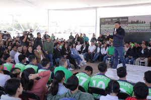 El Gobernador realizó la develación de la placa conmemorativa, así como el corte de listón inaugural de la cancha de fútbol, para posteriormente convivir con las y los alumnos, a quienes anunció que, en su próxima gira a Japón, gestionará nuevas inversiones que abran nuevas oportunidades de empleo bien remunerado para las y los estudiantes.