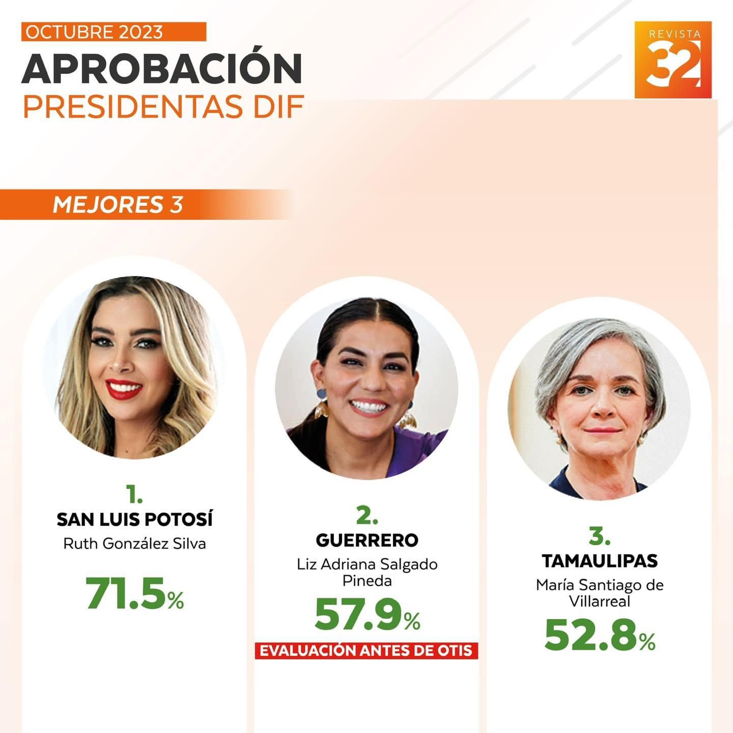 Ruth González Silva, presidenta honoraria del Sistema Estatal para el Desarrollo Integral de la Familia (DIF), ocupó el primer lugar nacional en desempeño con un 71.5 por ciento, de acuerdo con los resultados de la evaluación mensual correspondiente a octubre realizada por la casa encuestadora Arias Consultores.
