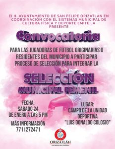 Con el objetivo de impulsar el deporte y empoderar a las mujeres deportistas del municipio, el Ayuntamiento de San Felipe Orizatlán, a través de su dirección de deportes, ha lanzado una convocatoria oficial para integrar la Selección Municipal Femenil de Fútbol.