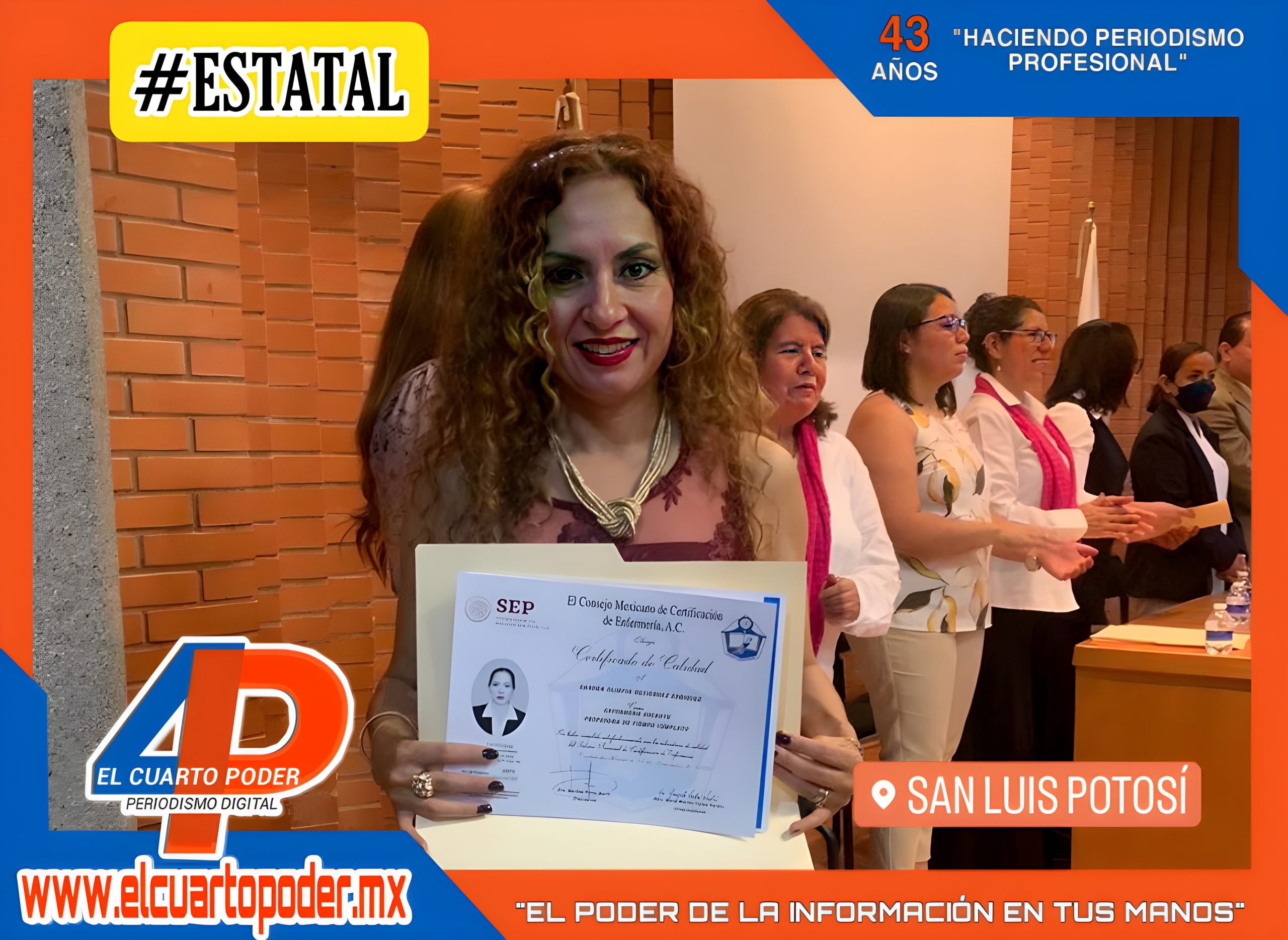 El Colegio de Enfermería del Estado de San Luis Potosí A.C. entregó Certificados de calidad a 20 profesionales de enfermería y además se otorgaron 5 Reconocimientos de excelencia a docentes y trabajadores de la salud, entre ellas a la Doctora Sandra Olimpia Gutiérrez Enríquez, investigadora de la Facultad de Enfermería de la UASLP.