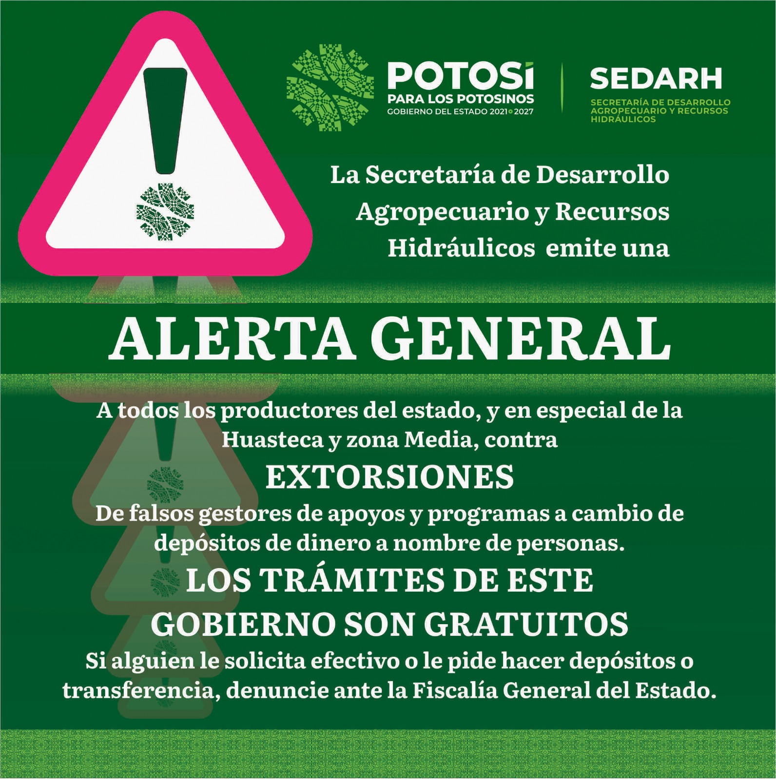 La Secretaría de Desarrollo Agropecuario y Recursos Hidráulicos (Sedarh), emitió una alerta general a las y los productores del campo, para evitar fraudes, ya que se han detectado falsos gestores que ayudados de perfiles de Facebook, WhatsApp, mensajes y llamadas, solicitan dinero a cambio de equipo, tractores, apoyos económicos o en especies animales, por lo que hizo un llamado a extremar precauciones, pues el Gobierno del cambio que dirige Ricardo Gallardo Cardona, no cobra por los trámites.