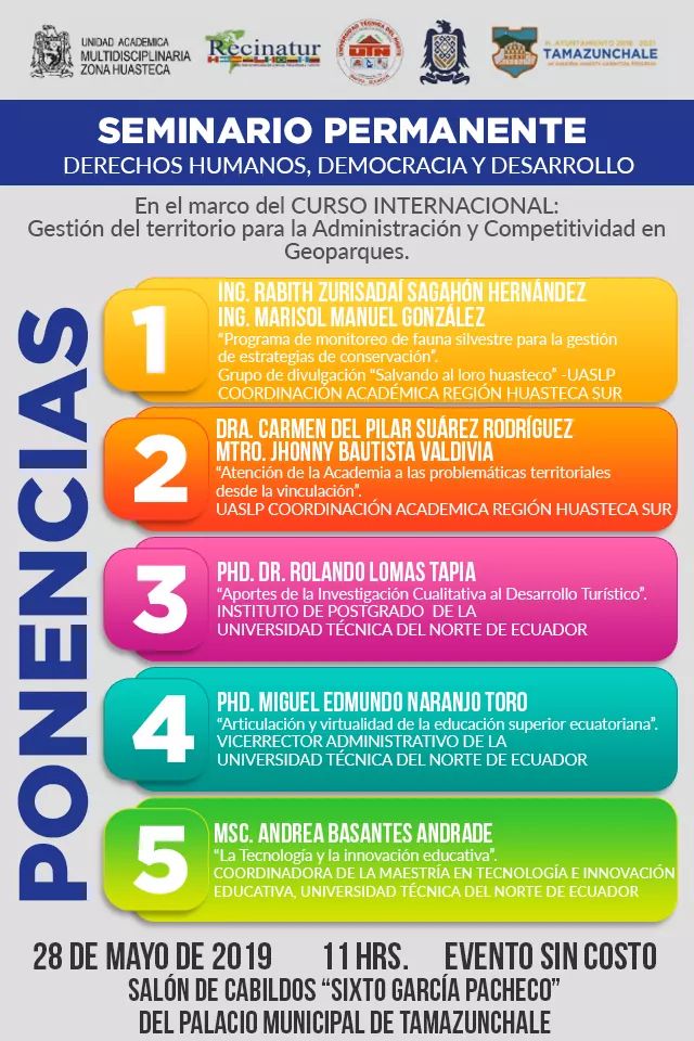 El Honorable Ayuntamiento de Tamazunchale que preside el Arq. Juan Antonio Costa Medina a través de la Coordinación de Educación Municipal invitan al Seminario Permanente: Derechos Humanos, Democracia y Desarrollo, que será impartido por la Universidad Autónoma de San Luis Potosí a través de la gestión del Consejo Municipal de Participación Social en la Educación.