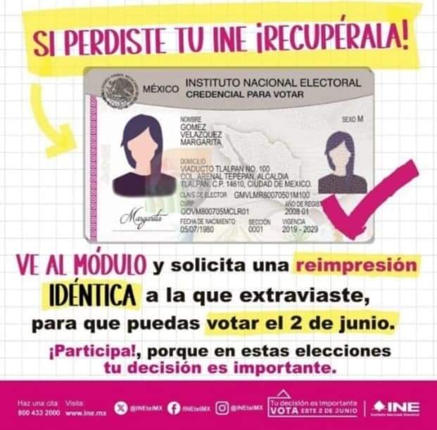 Si perdiste tu INE es momento de recuperarla, acude al módulo más cercano y solicita una reimpresión, si tu credencial es del 2023 y no la renovaste, no te preocupes sigue vigente!!!.