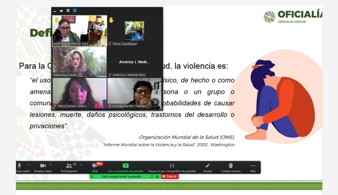 Maricela Oviedo, ponente del taller, explicó a las y los más de 50 participantes que la violencia y la discriminación se han generado por la dominación del sistema patriarcal, factores que son identificables para atender este tipo de problemáticas sociales a través de mecanismos de ayuda y orientación en instituciones diversas.