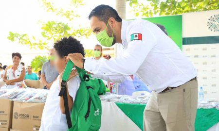 • En Ébano y Tamuín, el titular de Sedesore Juan Ignacio Segura Morquecho, hizo entrega de útiles escolares a las y los...