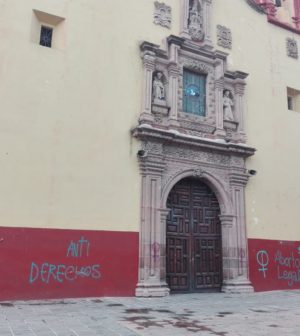 El templo de San Miguelito amaneció con pintas con las leyendas de: “Anti derechos”, “Aborto legal”, “será ley”, “Sacerdotes pederastas y pedófilos”, así como la exigencia a los diputados locales para que legislen para la despenalización del aborto.