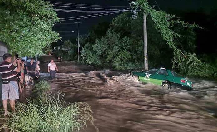 En el fraccionamiento Rosas del Tepeyac, un taxi se quedó varado en la furiosa corriente que pasa por ese lugar y que tenía años de no meterse entre patios y casas por el curso natural del agua.