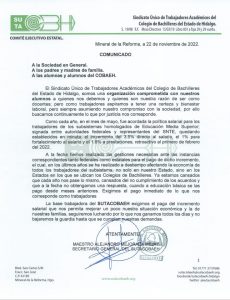 Lo anterior se da a conocer vía redes sociales en un documento signado por el Maestro Alejandro Mejorada Mejay, quien es el Secretario General del SUTACOBAEH.