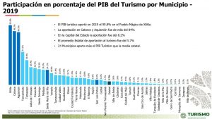 La titular de la dependencia Patricia Véliz Alemán, expuso que derivado de un análisis llevado a cabo por el área de Planeación, el sector turístico genera al menos el 6 por ciento del Producto Interno Bruto (PIB) del Estado, y se consolida como una actividad económica principal para miles de familias de las cuatro regiones de la Entidad, incluso en algunos municipios más del 90 por ciento de los recursos económicos que fluye, depende directamente de las y los visitantes a las zonas turísticas.