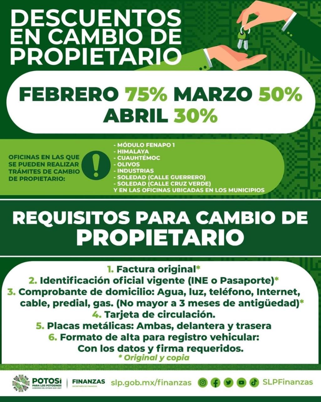 González Martínez detalló que para realizar el cambio de propietario deberán presentar la factura original del vehículo, identificación oficial vigente (INE o Pasaporte), comprobante de domicilio: agua, luz, teléfono, internet, cable, predial, gas (no mayor a tres meses de antigüedad), tarjeta de circulación, ambas placas metálicas, formato de alta para registro vehicular con los datos y firma requeridos. Para mayor detalle consultar la página oficial www.slpfinanzas.gob.mx o llamar al número 444-812-63-35.