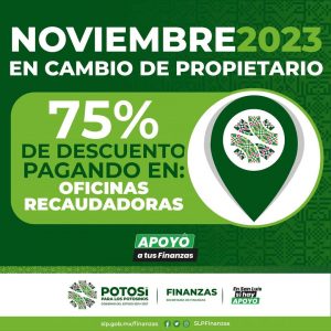 El titular de la dependencia estatal, Omar Valadez Macías, dijo que, de acuerdo con la instrucción del Gobernador Ricardo Gallardo Cardona, de brindar apoyo a la economía de las familias con estos trámites que, la herencia maldita mantenía con costos muy elevados, en el trámite de cambio de propietario el descuento es del 75 por ciento el cual se realiza en oficinas recaudadoras de todo el Estado.