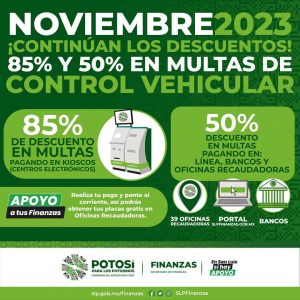 A fin de que más potosinas y potosinos accedan al programa estatal de placas gratuitas, la Secretaría de Finanzas de Gobierno del Estado (Sefin), llama a aprovechar los últimos días de descuentos en multas de control vehicular y en trámite de cambio de propietario, el cual culminará el día 30 de noviembre.