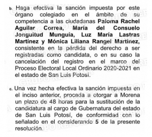 “Se sanciona a la ciudadana Mónica Liliana Rangel Martínez, con la cancelación del registro como candidata al cargo de Gubernatura, en el marco del Proceso Electoral Local Ordinario 2020-2021 en el estado de San Luis Potosí, de conformidad con las razones y fundamentos expuestos”, indica el resolutivo de la Unidad de Fiscalización