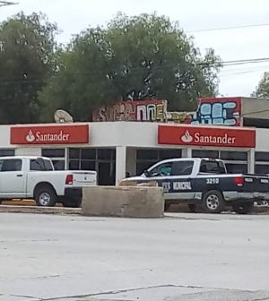 Dos sujetos con armas cortas perpetraron violento asalto en la sucursal de banco Santander, en la esquina de avenida Industrias y Eje 114. Se llevaron un botín que no ha sido cuantificado. Agentes metropolitanos y de la Fiscalía General acudieron al lugar.