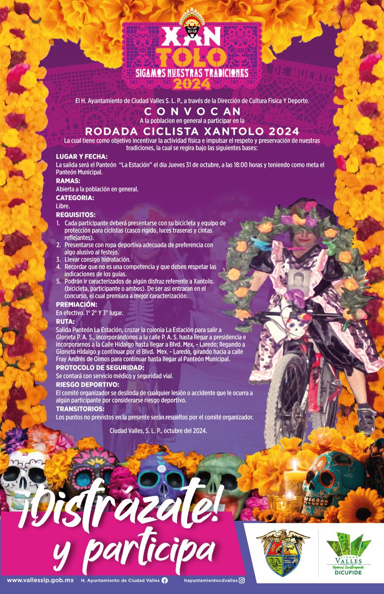 El H. Ayuntamiento de Ciudad Valles, a través de la Dirección de Cultura Física y Deporte, invita a la población a participar en la Rodada Ciclista Xantolo 2024 que se llevará a cabo el jueves 31 de octubre a las 18:00 horas, partiendo del Panteón de La Estación y finalizando en el Panteón Municipal.