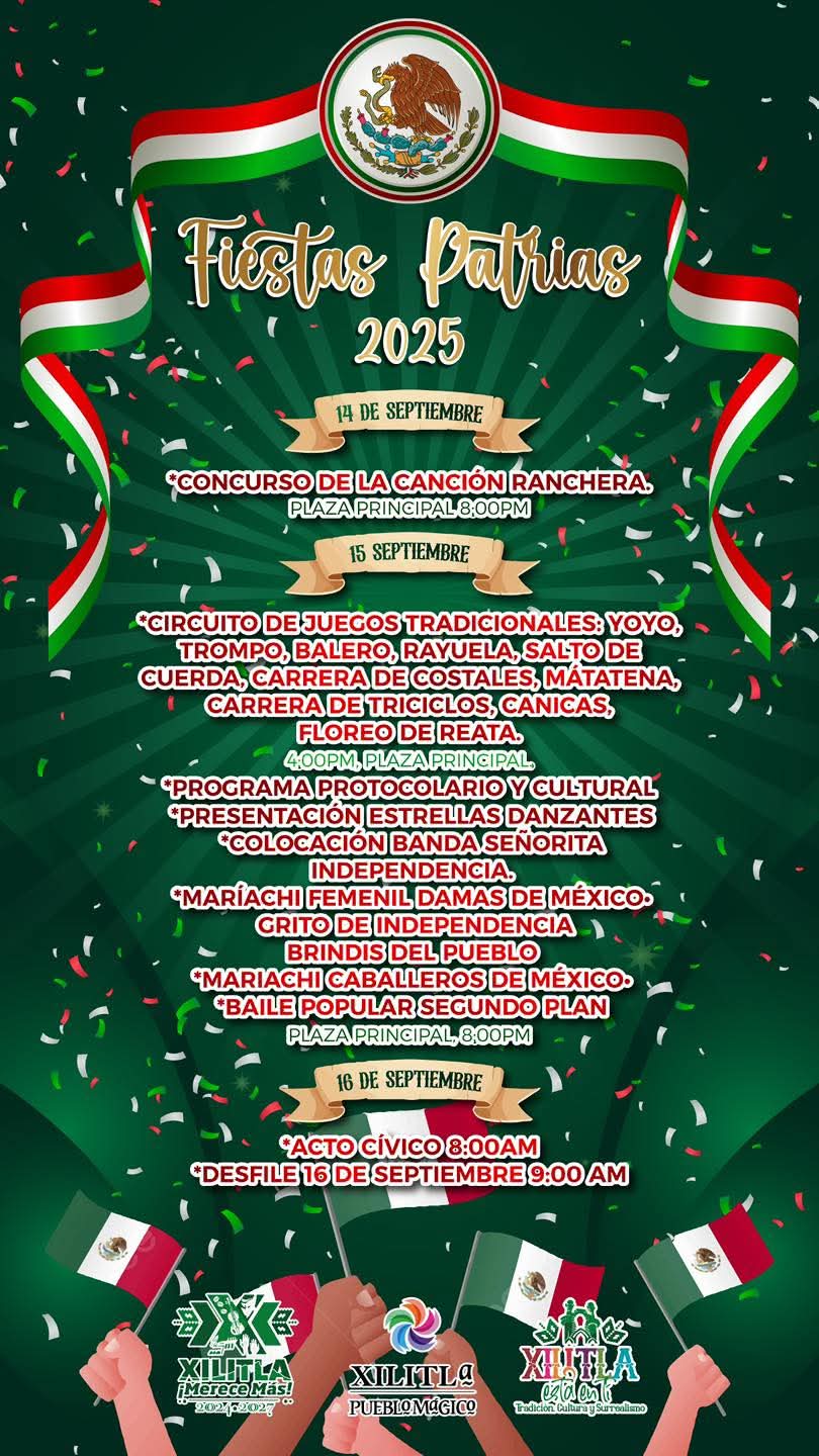 El Ayuntamiento de Xilitla invita a toda la ciudadanía a disfrutar del gran programa cultural que dará inicio este 15 de septiembre a las 8:00 p.m. en la Plaza Principal.
