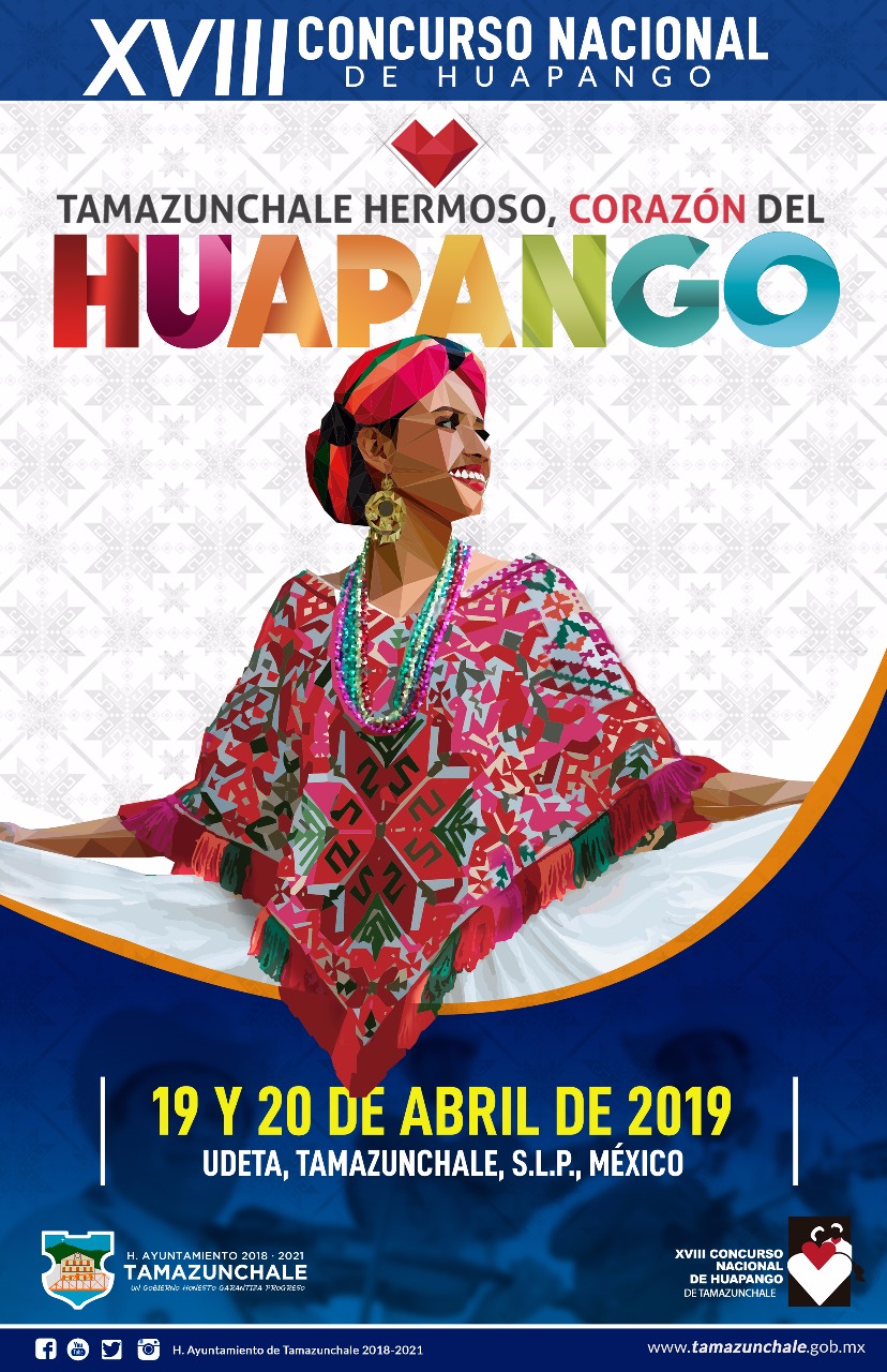 El Honorable Ayuntamiento de Tamazunchale que preside el Arq. Juan Antonio Costa Medina, a través de la Casa de la Cultura, da a conocer el cartel oficial del XVIII Concurso Nacional de Huapango, denominado Tamazunchale Hermoso, Corazón del Huapango; el cual se realizará los días 19 y 20 de abril de 2019 en la Unidad Deportiva de Tamazunchale.