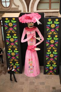 En Palacio de Gobierno fueron colocadas letras realizadas con flores de cempasúchil y un arco a la entrada del recinto, además de máscaras del Xantolo y se prepara en el interior un altar monumental flanqueado por dos coloridas catrinas.