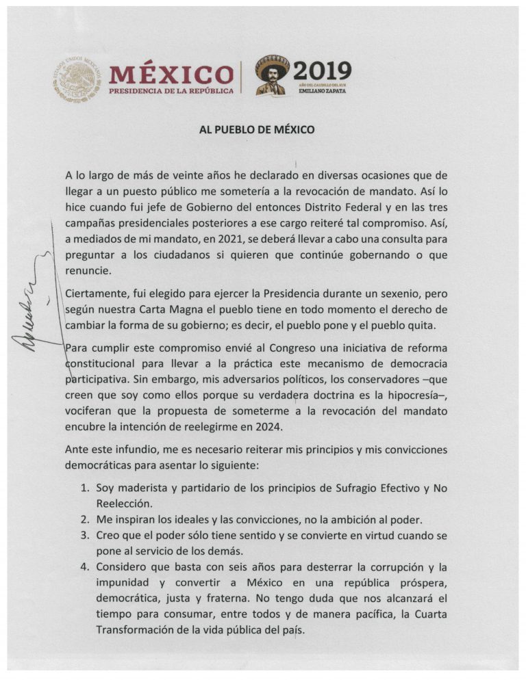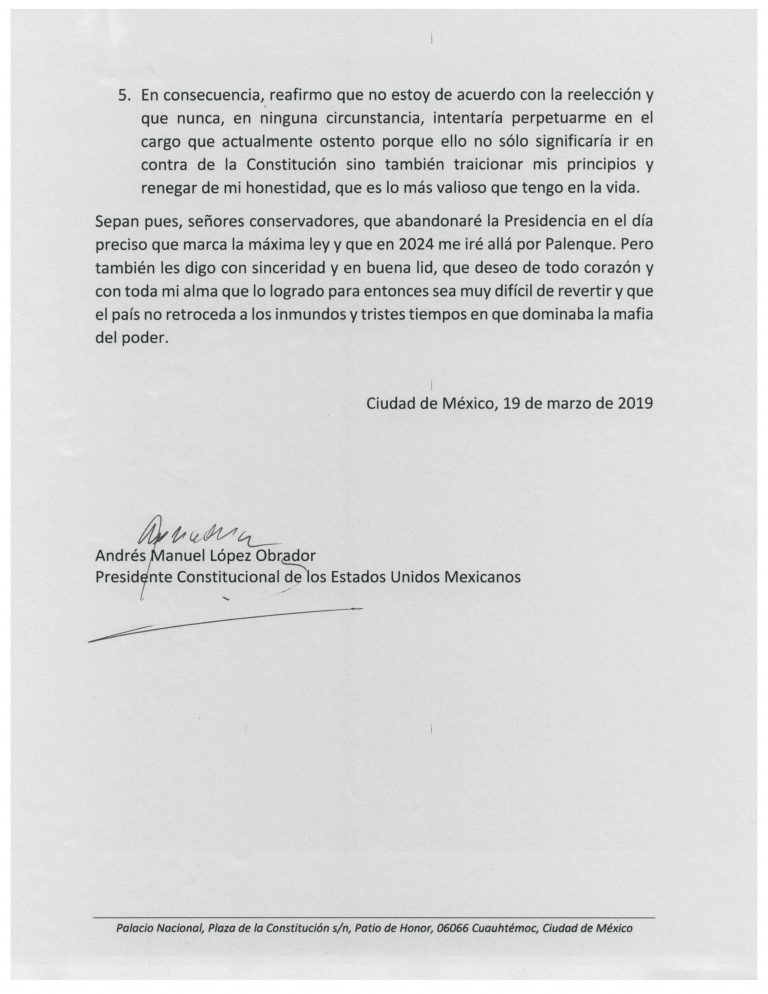 Andrés Manuel López Obrador arrancó su conferencia mañanera de este 19 de marzo con un solemne evento: la firma de una carta compromiso sobre su no reelección. En el evento, AMLO comentó que con seis años tiene, que no le gusta el poder, que apenas temine su mandato se irá a La Chingada —su quinta rústica en Palenque, Chiapas— y de paso se dijo maderista… ya saben, lo mismo que ha dicho desde la campaña nomás que ahora lo firmó.